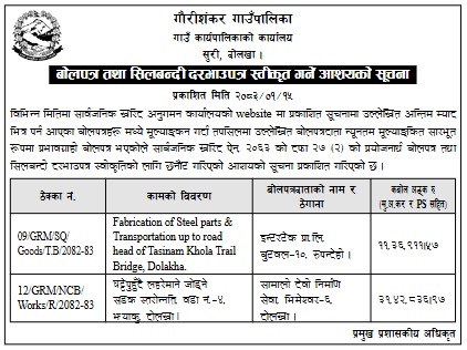 बोलपत्र तथा सिलबन्दी दरभाउपत्र स्वीकृत गर्ने आशयको सूचना ।