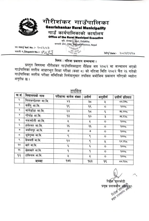 आधारभूत शिक्षा परिक्षा कक्षा ८ को नतिजा प्रकाशन सम्बन्धमा ।