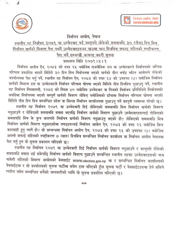 निर्वाचन खर्चको विवरण पेश नगर्ने उम्मेदवारहरुको लागि सात दिन भित्र सफाइ सहितको स्पस्टिकरण पेश गर्ने सम्बन्धी अत्यन्त जरुरी सूचना