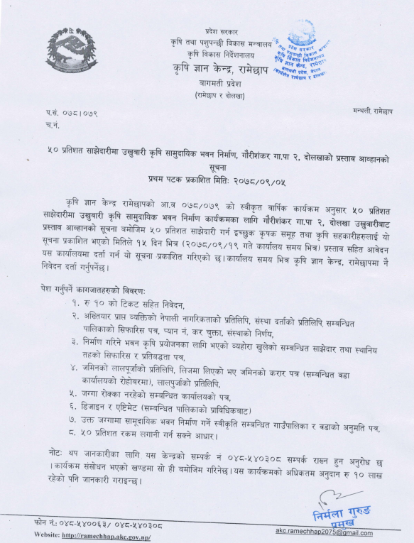 ५० प्रतिशत साझेदारीमा उखुबारी कृषि समुदायीक भबन निर्माण गौरीशंकर गा.पा. २,दोलखाको प्रस्ताब आह्वानको सूचना